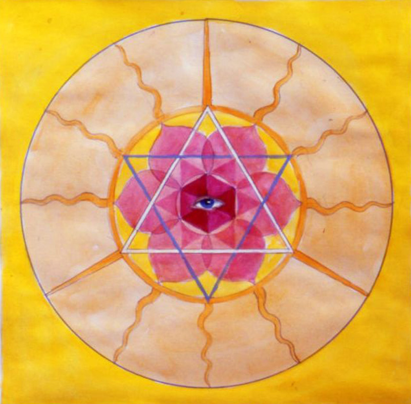 Heart Chakra It is not only radiating light, but has two triangles in it. In the inner circle is the intersection of the male (upward-pointing) and the female (downward-pointing) triangles, surrounded by lotus leaves. In the central hexagram, the Divine Eye rests in the ruby. |